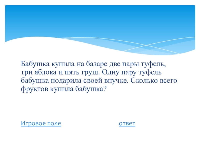 Слайд 15Бабушка купила на базаре две пары туфель, три яблока и пять