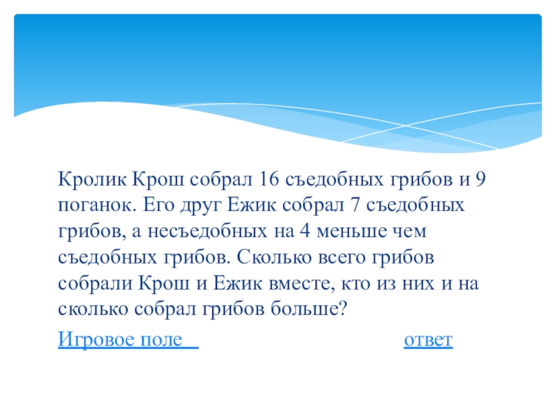 Слайд 9Кролик Крош собрал 16 съедобных грибов и 9 поганок. Его друг