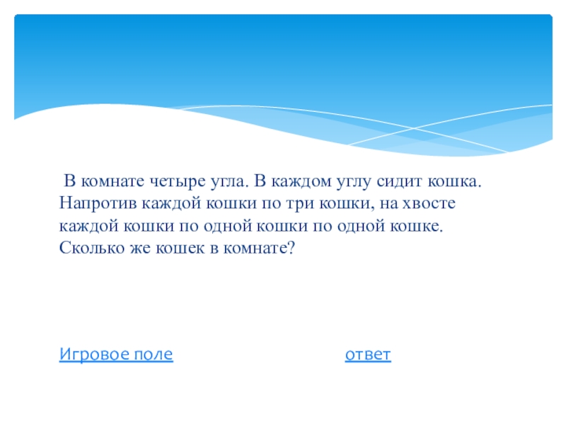 Слайд 11 В комнате четыре угла. В каждом углу сидит кошка. Напротив каждой