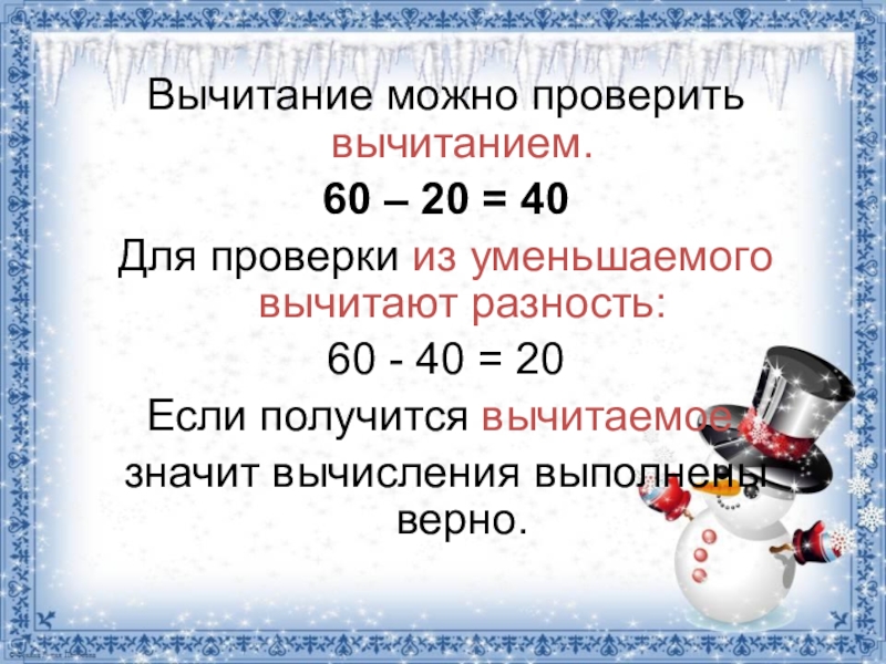 Вычитание можно проверить вычитанием.60 – 20 = 40Для проверки из уменьшаемого вычитают разность:60 - 40 = 20Если