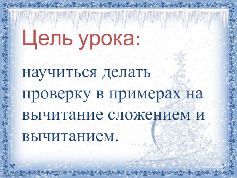 научиться делать проверку в примерах на вычитание сложением и вычитанием.Цель урока: