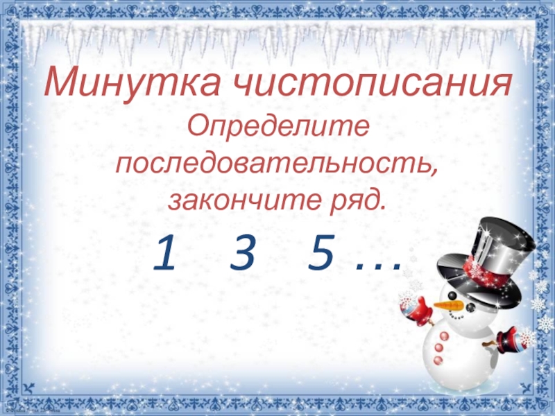 Слайд 3 Минутка чистописания Определите последовательность, закончите ряд. 1 3 5 …