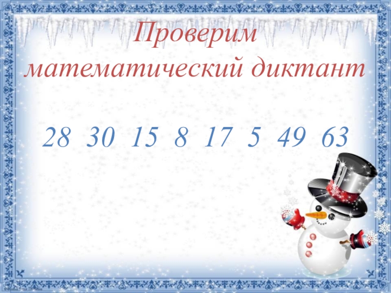 Слайд 6Проверим математический диктант 28 30 15 8 17 5 49 63