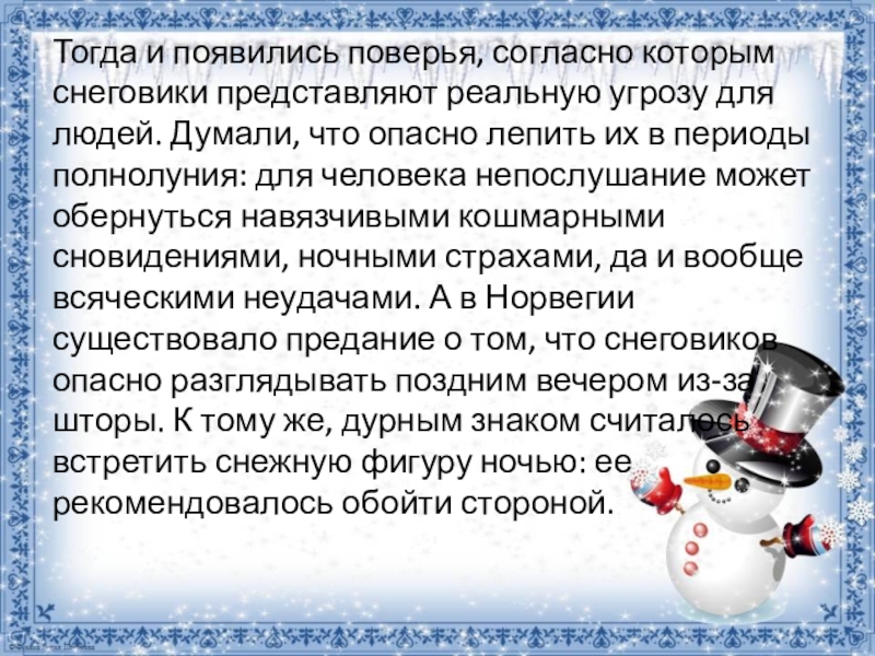 Слайд 15Тогда и появились поверья, согласно которым снеговики представляют реальную угрозу для