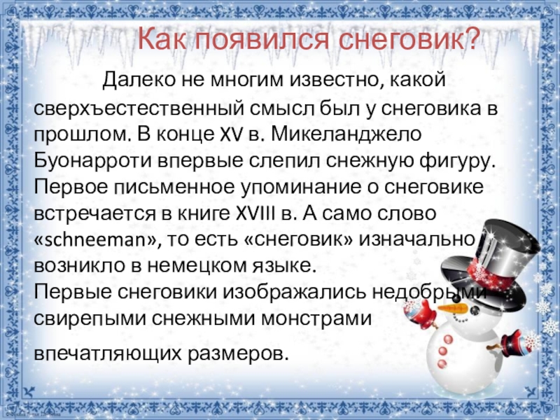 Далеко не многим известно, какой сверхъестественный смысл был у снеговика в прошлом. В конце XV в. Микеланджело Буонарроти впервые слепил снежную фигуру. Первое письменное упоминание о снеговике встречается в книге XVIII в. А само слово «schneeman», то есть «снеговик» изначально возникло в немецком языке. Первые снеговики изображались недобрыми свирепыми снежными монстрами впечатляющих размеров.
