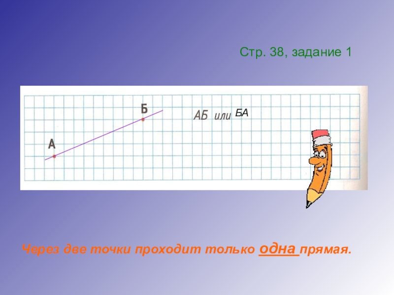 Стр. 38, задание 1БАЧерез две точки проходит только одна прямая.