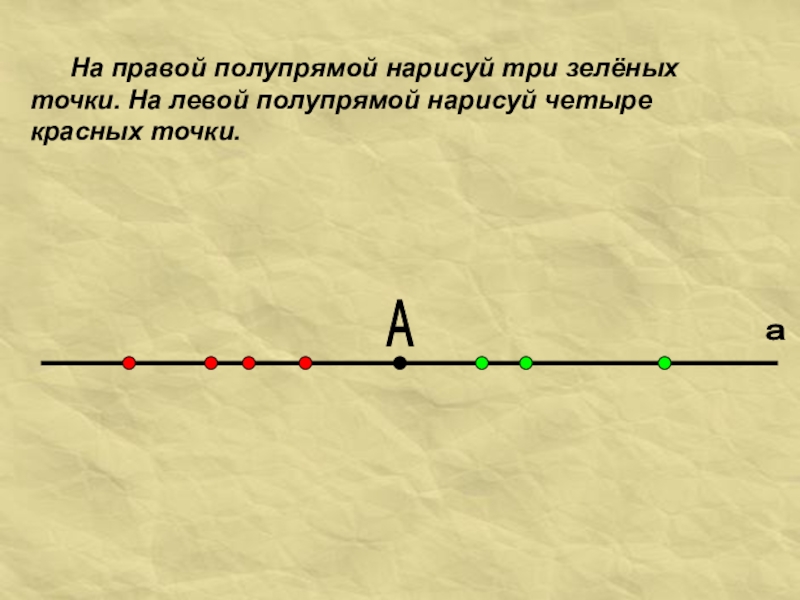 А а 	На правой полупрямой нарисуй три зелёных точки. На левой полупрямой нарисуй четыре красных точки.