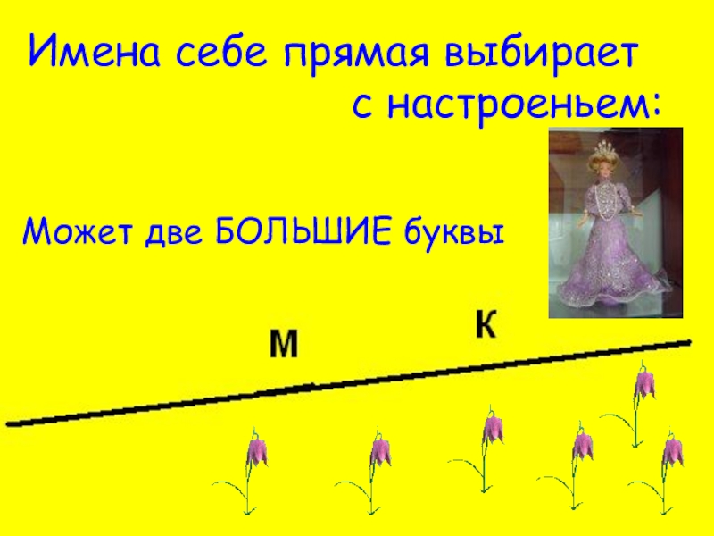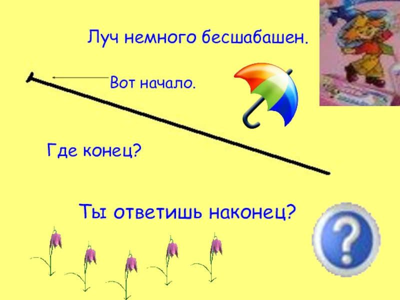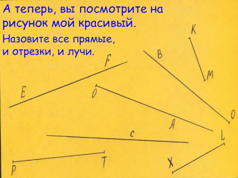 А теперь, вы посмотрите на рисунок мой красивый. Назовите все прямые, и отрезки, и лучи.