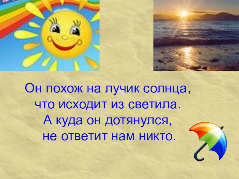 Слайд 18 Он похож на лучик солнца, что исходит из светила. А куда он