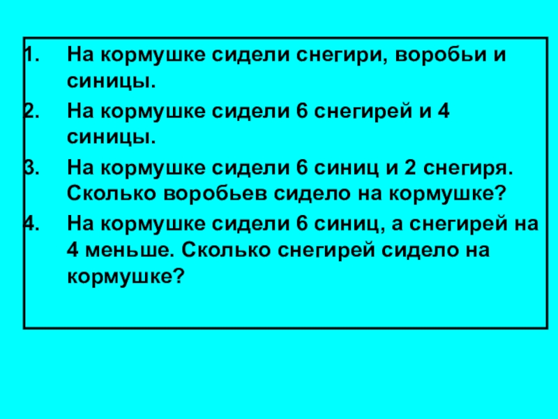 На кормушке сидели 6 синиц, а снегирей на 4 меньше. Сколько снегирей сидело на кормушке?