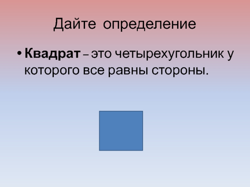 Дайте определениеКвадрат – это четырехугольник у которого все равны стороны.
