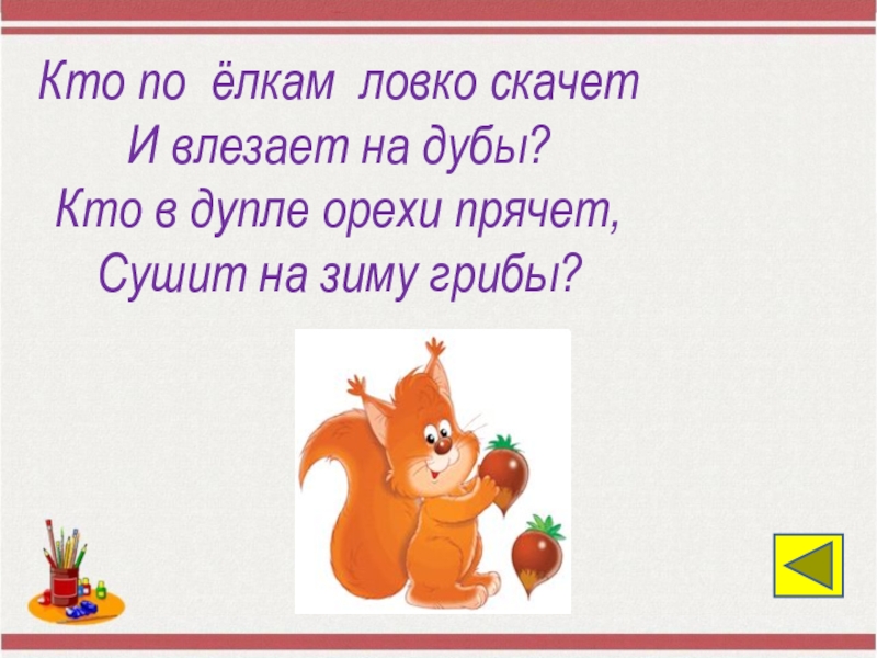 Кто по ёлкам ловко скачет И влезает на дубы?Кто в дупле орехи прячет,Сушит на зиму грибы?