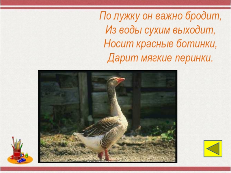 По лужку он важно бродит,Из воды сухим выходит,Носит красные ботинки,Дарит мягкие перинки.