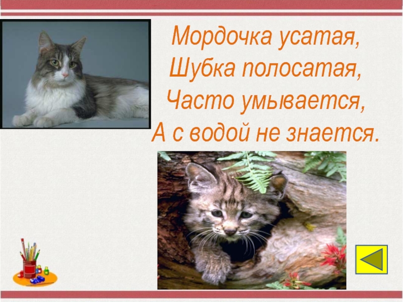 Мордочка усатая, Шубка полосатая, Часто умывается,А с водой не знается.