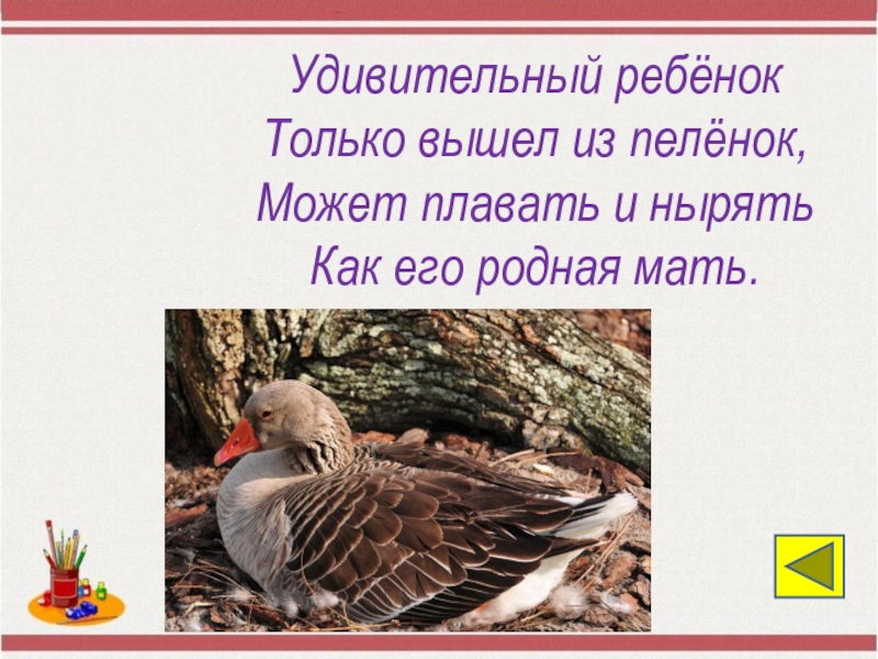 Удивительный ребёнокТолько вышел из пелёнок,Может плавать и нырятьКак его родная мать.