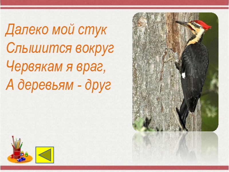 Далеко мой стукСлышится вокругЧервякам я враг,А деревьям - друг