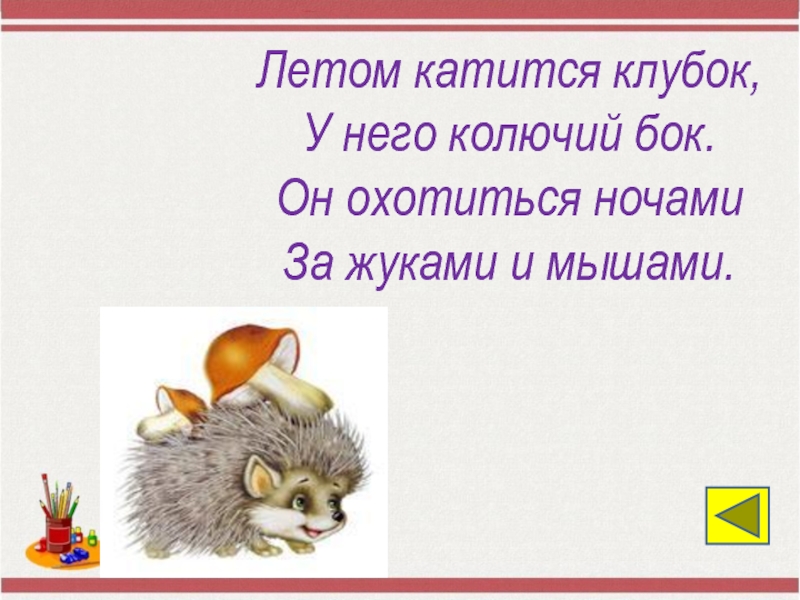 Летом катится клубок,У него колючий бок.Он охотиться ночамиЗа жуками и мышами.