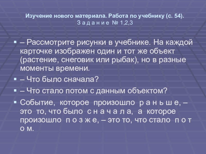 – Рассмотрите рисунки в учебнике. На каждой карточке изображен один и тот же объект (растение, снеговик или рыбак), но в разные моменты времени.