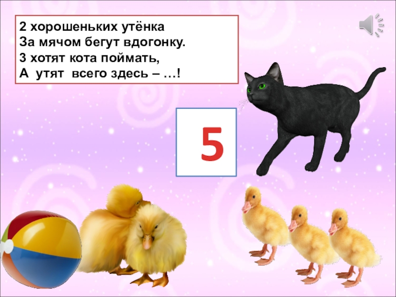 2 хорошеньких утёнкаЗа мячом бегут вдогонку.3 хотят кота поймать, А утят всего здесь – …! 5