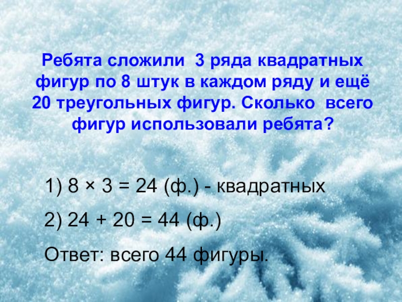 Ребята сложили 3 ряда квадратных фигур по 8 штук в каждом ряду и ещё 20 треугольных фигур. Сколько всего фигур использовали ребята?