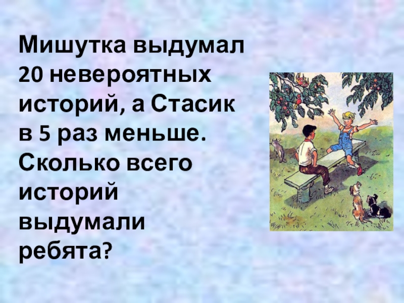 Мишутка выдумал 20 невероятных историй, а Стасик в 5 раз меньше. Сколько всего историй выдумали ребята?