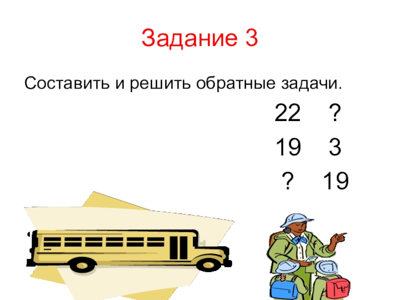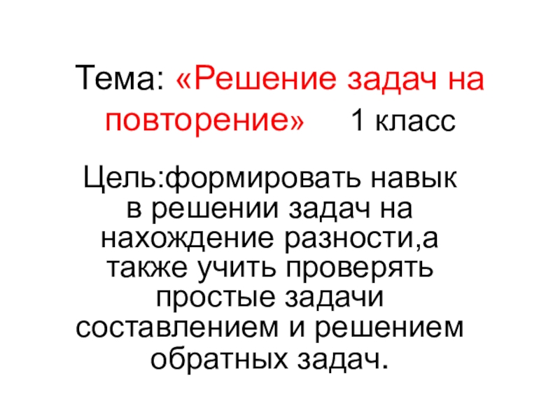 Цель:формировать навык в решении задач на нахождение разности,а также учить проверять простые задачи составлением и решением обратных задач.