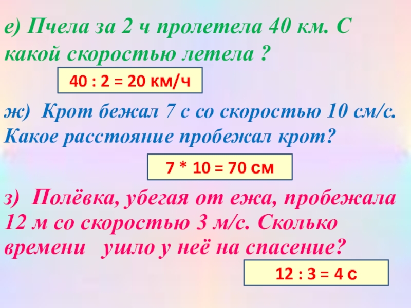 ж) Крот бежал 7 с со скоростью 10 см/с. Какое расстояние пробежал крот?