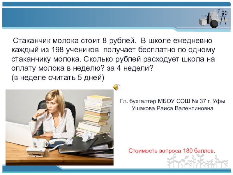 Стаканчик молока стоит 8 рублей. В школе ежедневно