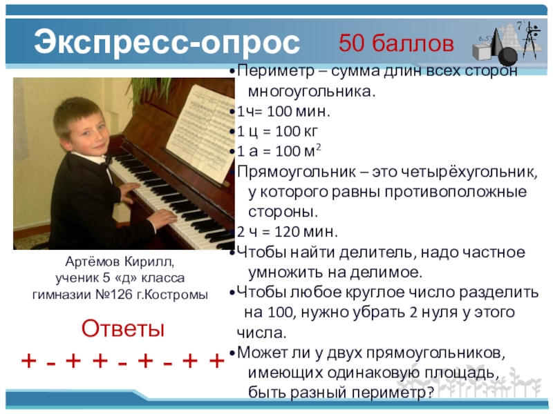 Это сайт презентаций, где можно хранить и обмениваться своими презентациями, докладами, проектами, шаблонами в формате PowerPoint с другими пользователями. Мы помогаем школьникам, студентам, учителям, преподавателям хранить и обмениваться учебными материалами.
