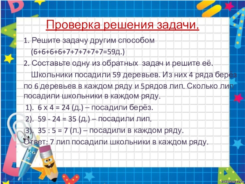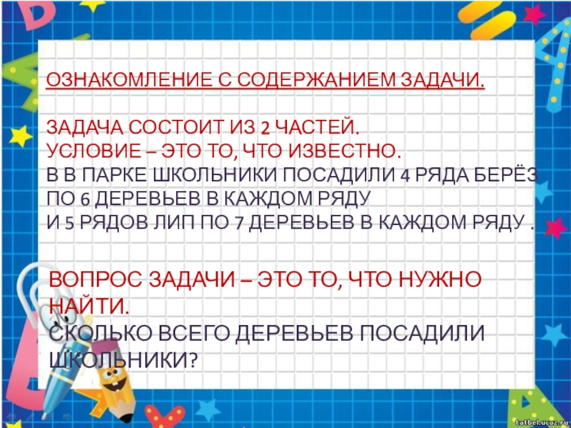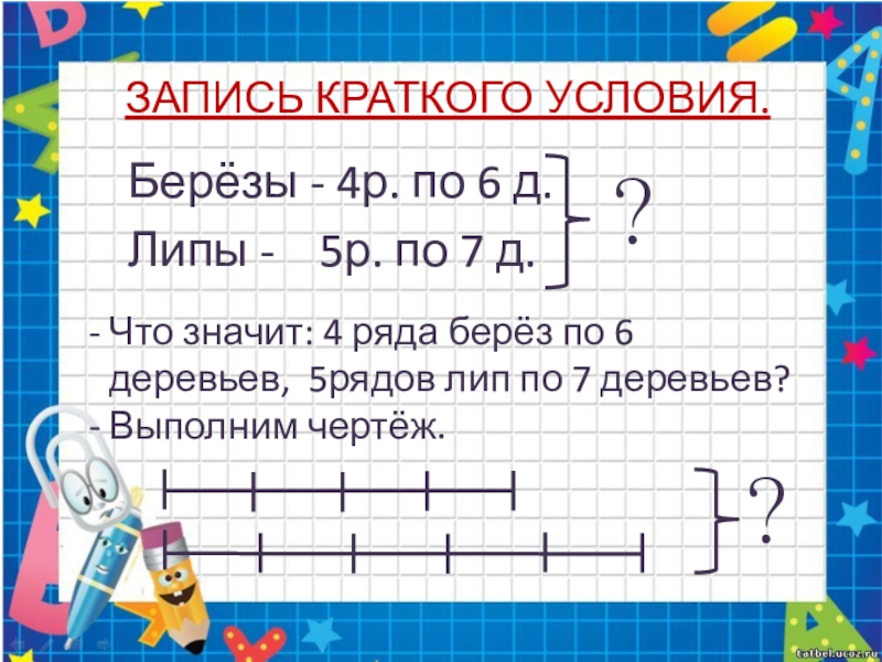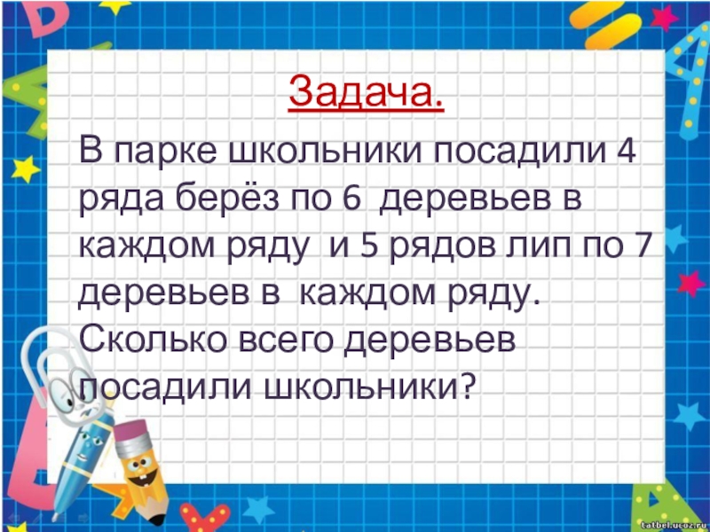 Что значит: 4 ряда берёз по 6 деревьев, 5рядов лип по 7 деревьев?