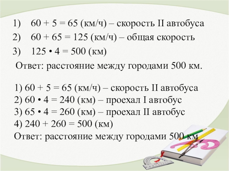 1) 60 + 5 = 65 (км/ч) – скорость II автобуса
