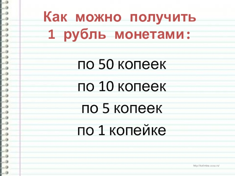 Слайд 5Как можно получить 1 рубль монетами: