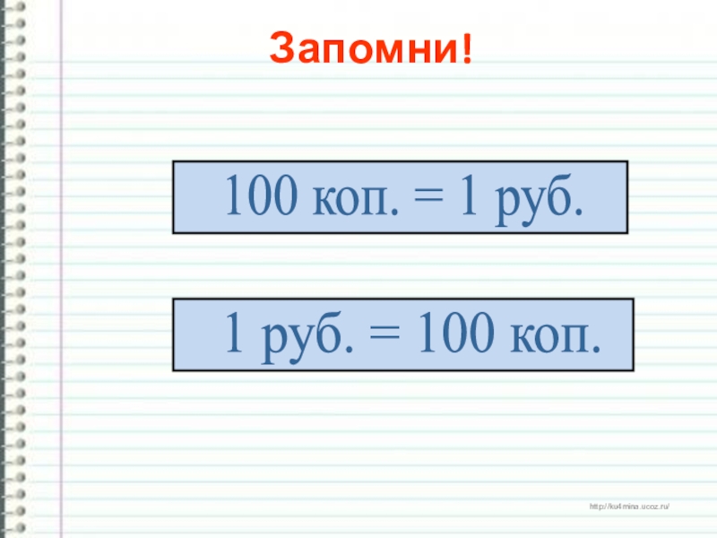 Запомни!100 коп. = 1 руб.1 руб. = 100 коп.