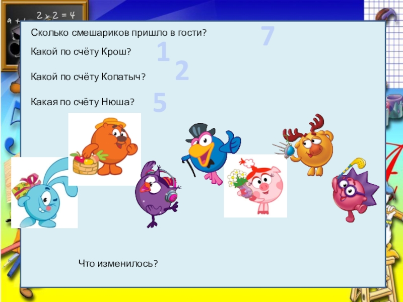 Сколько смешариков пришло в гости?7Какой по счёту Крош?1Какой по счёту Копатыч?2Какая по счёту Нюша?5Что изменилось?
