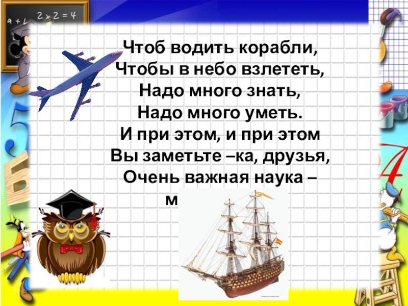 Чтоб водить корабли,Чтобы в небо взлететь,Надо много знать,Надо много уметь.И при этом, и при этомВы заметьте –ка, друзья,Очень важная наука – математика!