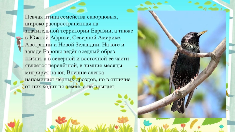 Слайд 2Певчая птица семейства скворцовых, широко распространённая на значительной территории Евразии, а