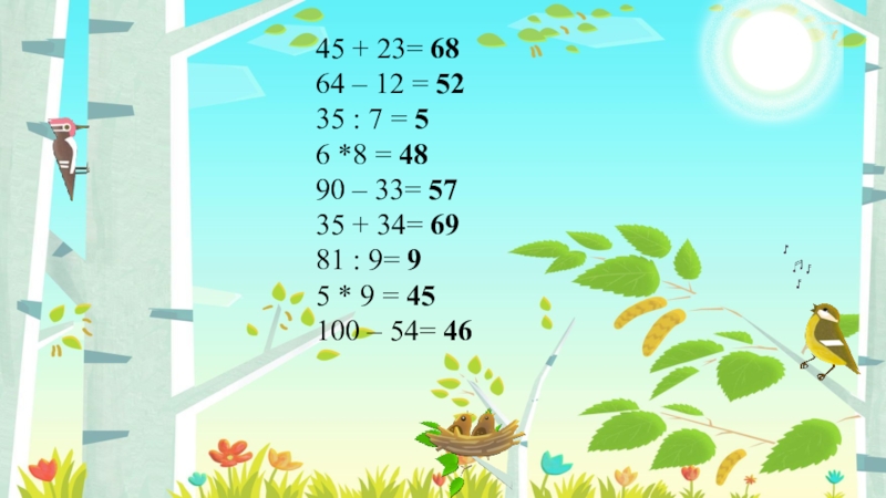 45 + 23= 6864 – 12 = 5235 : 7 = 56 *8 = 48 90 –