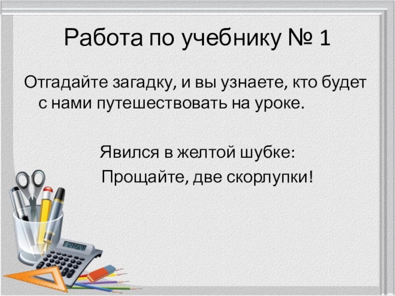 Работа по учебнику № 1Отгадайте загадку, и вы узнаете, кто будет с нами путешествовать на уроке.	Явился в