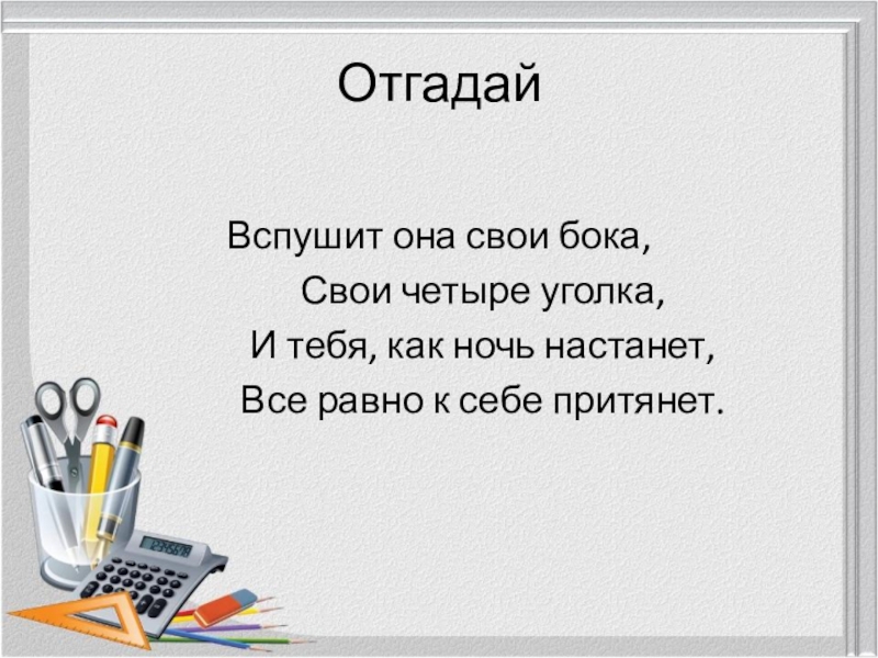 ОтгадайВспушит она свои бока,		Свои четыре уголка,		И тебя, как ночь настанет,		Все равно к себе притянет.