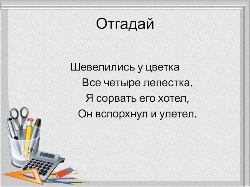 ОтгадайШевелились у цветка		Все четыре лепестка.		Я сорвать его хотел,		Он вспорхнул и улетел.