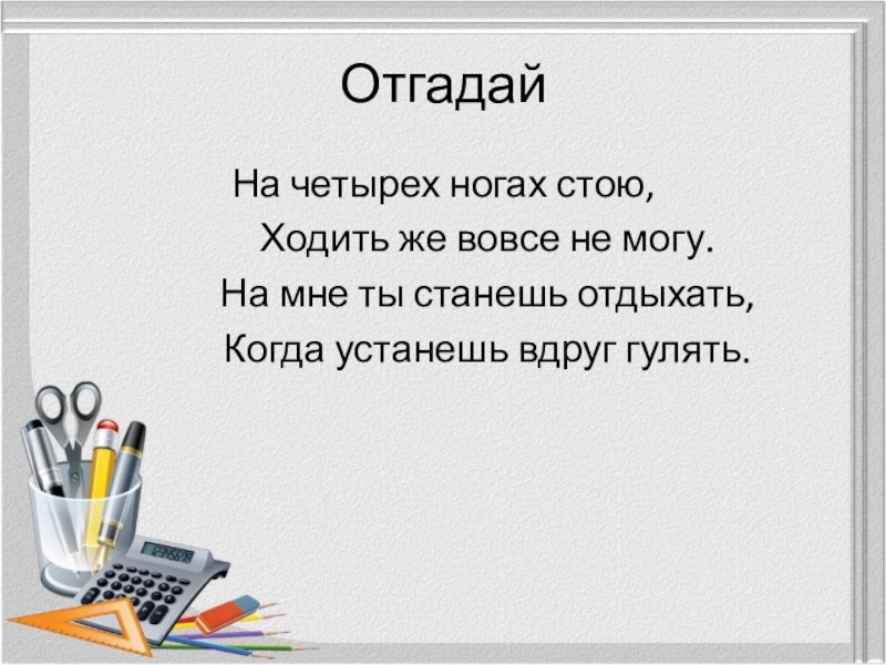 ОтгадайНа четырех ногах стою,		Ходить же вовсе не могу.		На мне ты станешь отдыхать,		Когда устанешь вдруг гулять.