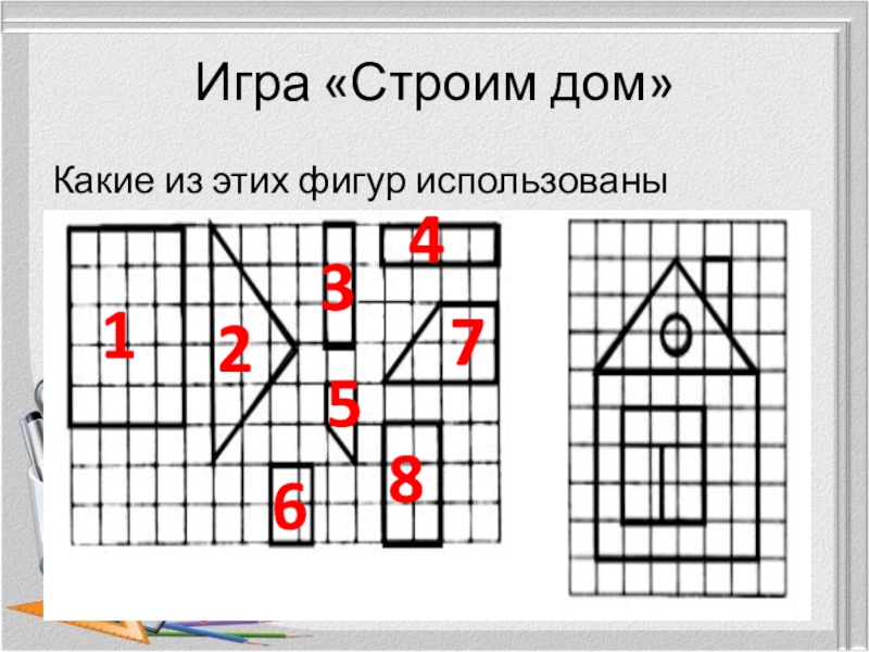 Игра «Строим дом»Какие из этих фигур использованы в домике?12345678