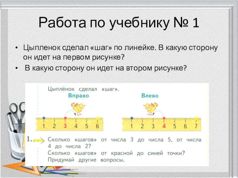 Работа по учебнику № 1Цыпленок сделал «шаг» по линейке. В какую сторону он идет на первом рисунке?