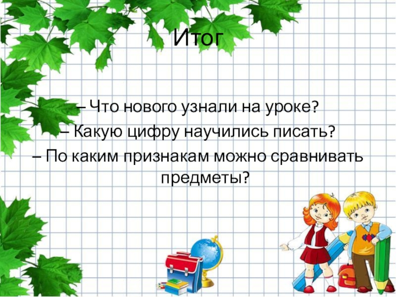 Итог– Что нового узнали на уроке?– Какую цифру научились писать?– По каким признакам можно сравнивать предметы?