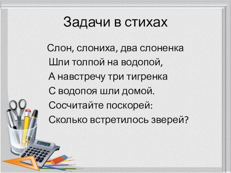 Задачи в стихахСлон, слониха, два слоненка			Шли толпой на водопой,			А навстречу три тигренка			С водопоя шли домой.			Сосчитайте поскорей:			Сколько встретилось