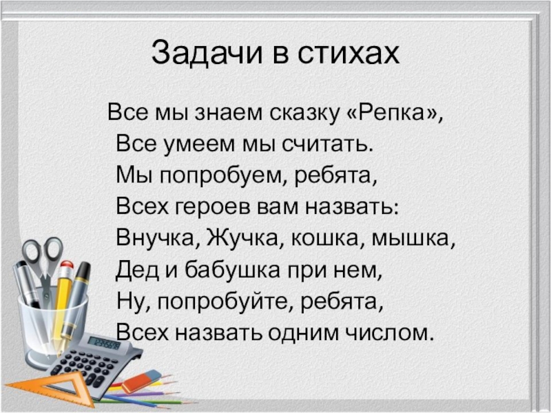 Задачи в стихахВсе мы знаем сказку «Репка»,			Все умеем мы считать.			Мы попробуем, ребята,			Всех героев вам назвать:			Внучка, Жучка, кошка,