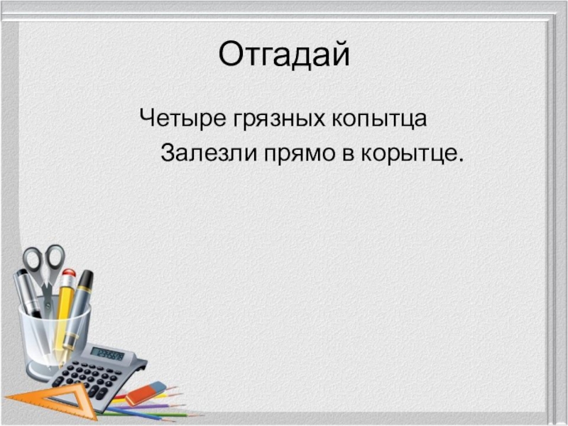 ОтгадайЧетыре грязных копытца		Залезли прямо в корытце.
