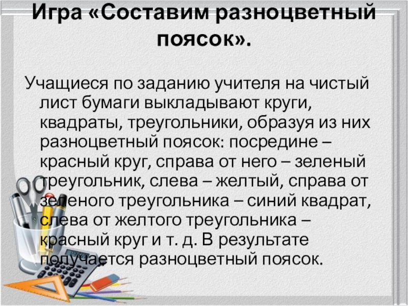 Игра «Составим разноцветный поясок». Учащиеся по заданию учителя на чистый лист бумаги выкладывают круги, квадраты, треугольники, образуя
