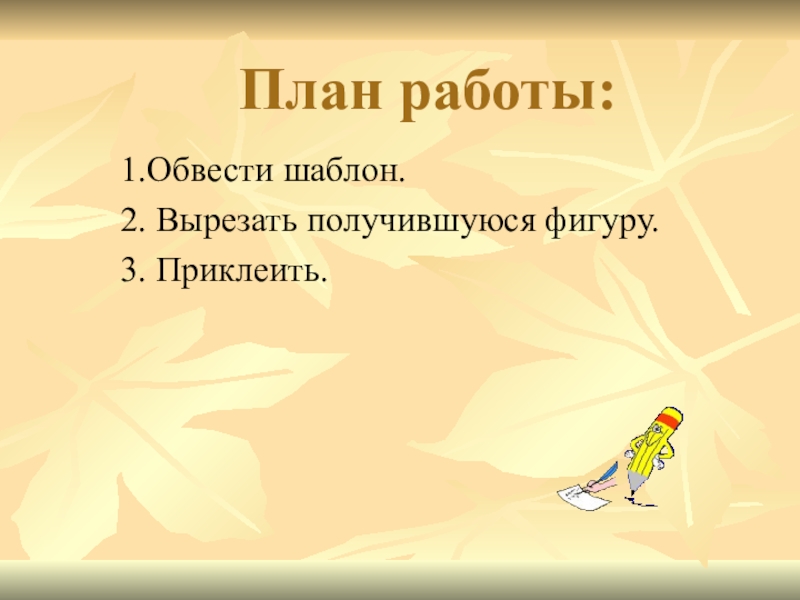 План работы:1.Обвести шаблон.2. Вырезать получившуюся фигуру.3. Приклеить.