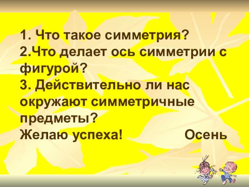 1. Что такое симметрия? 2.Что делает ось симметрии с фигурой?  3. Действительно ли нас окружают симметричные